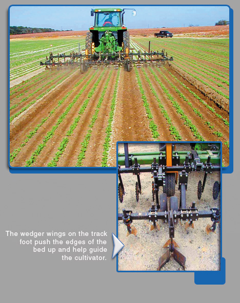 The ripple coulter cultivator cuts any debris so that it does not wrap on the sweep, causing the soil to push. The wedger wings on the track foot push the edges of the bed up and help guide the cultivator. The wavy coulter and flat sweeps are adjustable right or left and up or down on a 2 1/2" sq bar. The gauge wheels are adjustable and control the depth of the sweep bar.