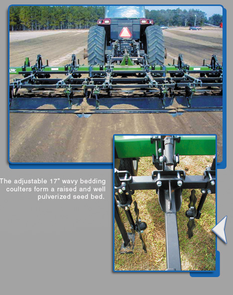 The combination of a front mounted coulter, lifter shank, bedder coulters, baskets and leveling doors (with bed shapers) thoroughly prepares the soil for flawless planting, while the adjustable 17 inch wavy bedding coulters form a raised and well pulverized seed bed.